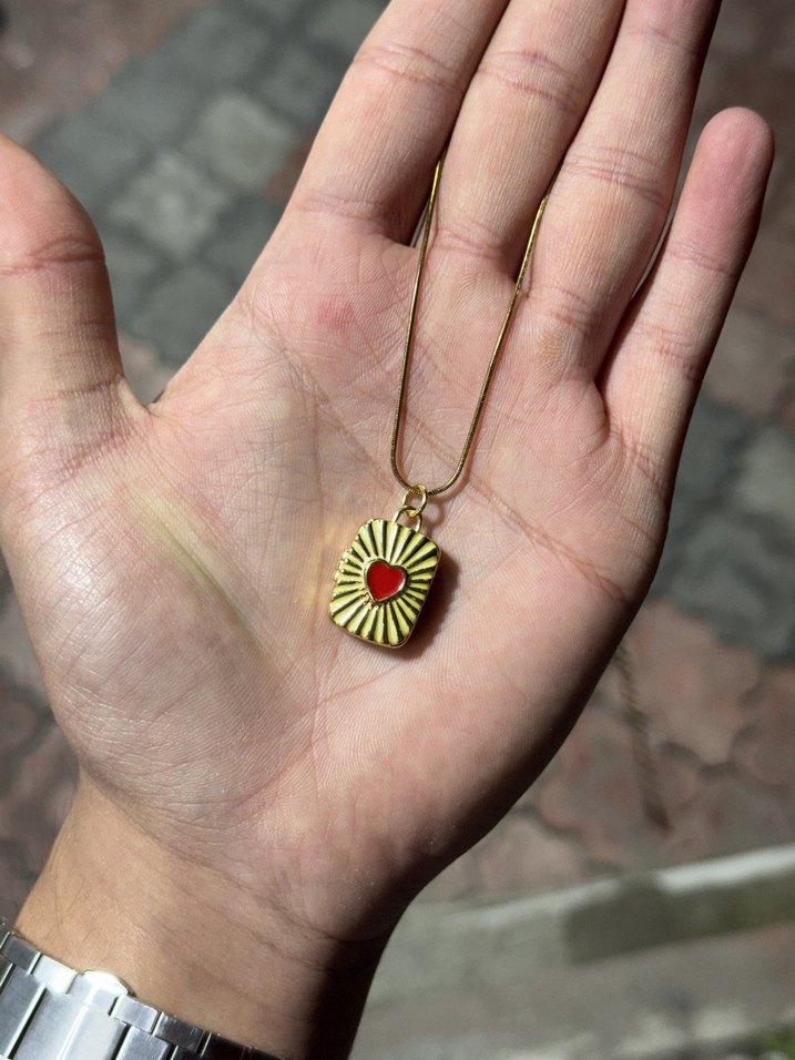 Altın renginde, zincir detaylı ve kırmızı kalp figürlü dikdörtgen kolye. Parlak yüzeyli, midi uzunlukta ve günlük kullanım için uygun.