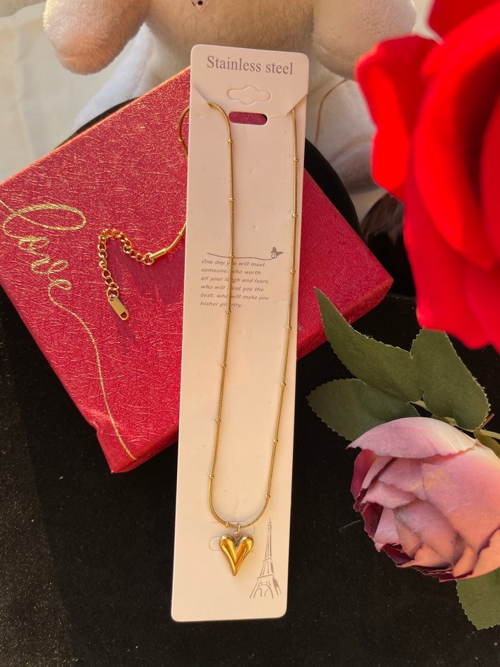 Paslanmaz çelikten yapılmış, zincir detaylı altın renkli midi uzunluğunda kolye. Üzerinde baskılı kalp figürü bulunur, romantik akşamlar için uygun. ❤️