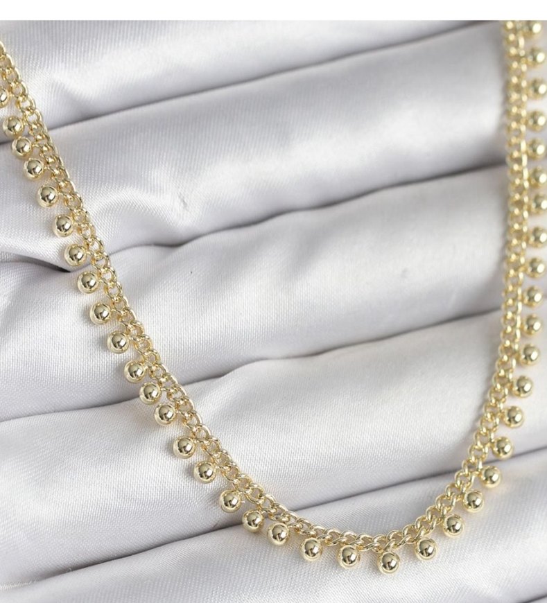 Altın renginde, zincir detaylı ve küçük yuvarlak süslemelerle bezenmiş midi uzunlukta kolye. Parlak ve nakışlı bohem tarzıyla düğün ve özel günler için uygun. ✨