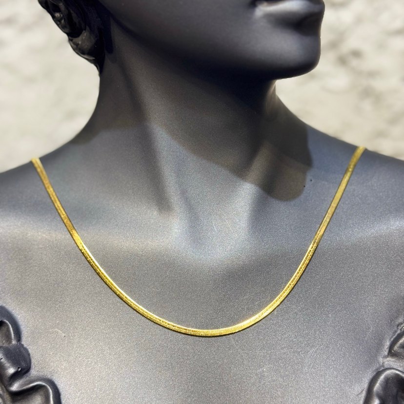 Parlak altın renkli, zincir detaylı ve yılan deseni bulunan midi uzunlukta minimalist tasarımlı kolye. Günlük kullanım için klasik zarafet sunar.