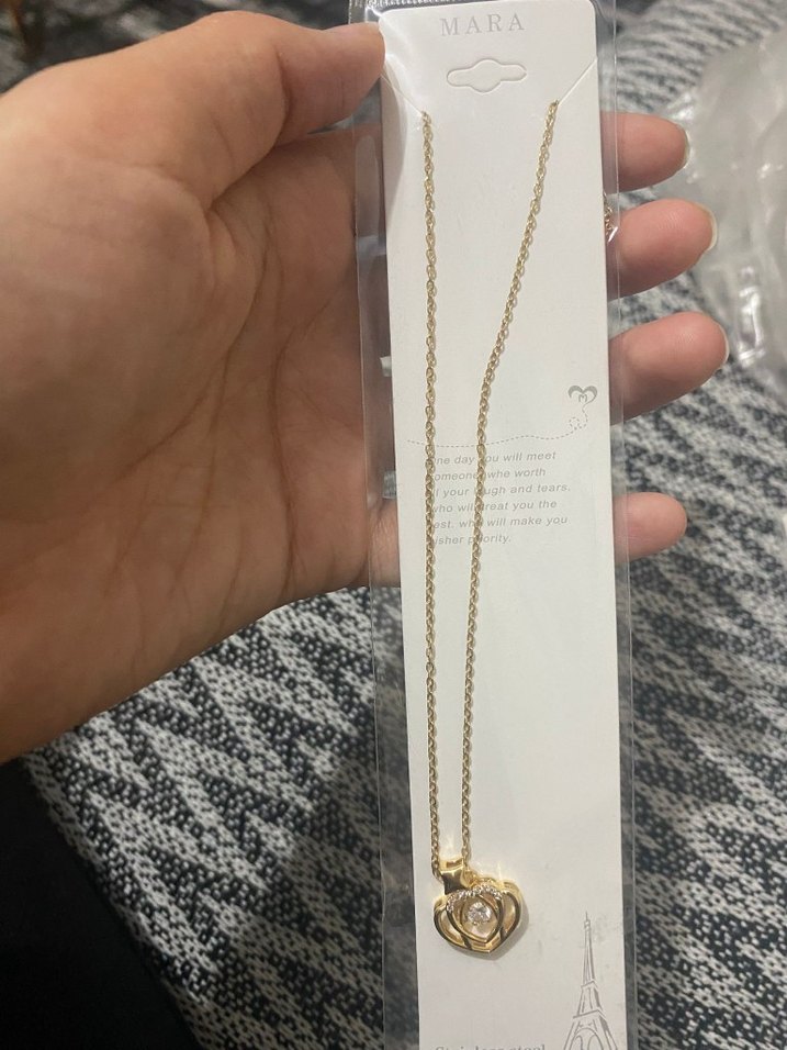Parlak kalp figürlü, zincir detaylı altın renkli midi kolye. Günlük sokak stiline uygun, normal uzunlukta. Marka: MARA.