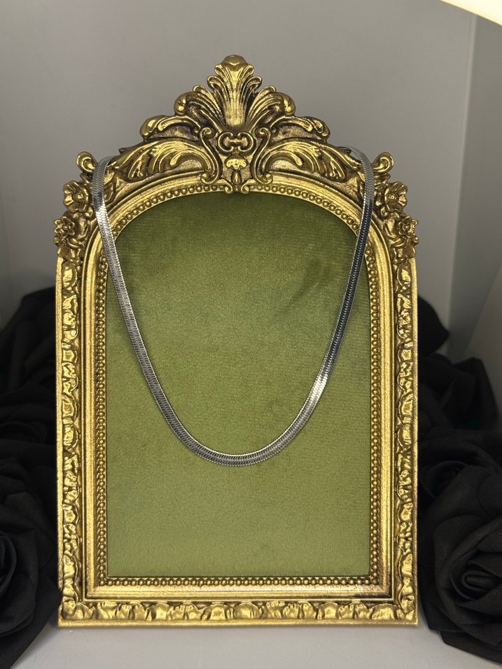 Altın renkli, zincir detaylı ve parlak yüzeyli bu kolye, yılan deri desenine sahip modern klasik tarzıyla düğünlere uygun. Normal midi uzunlukta, vintage esintili şıklık sunar.