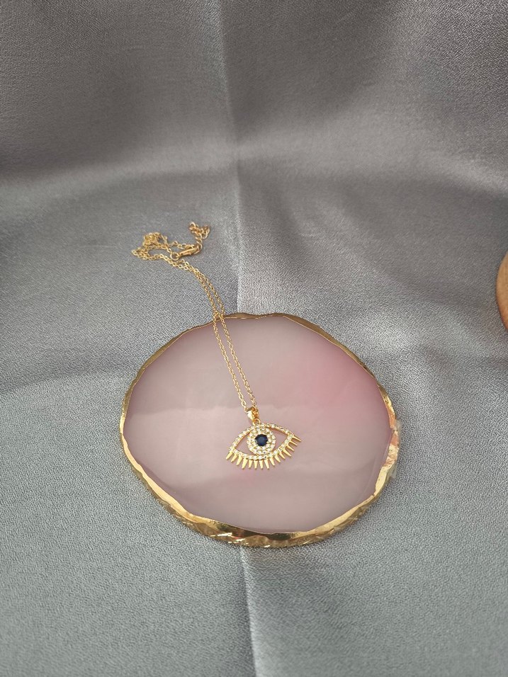 Altın renginde, zincir detaylı ve kısa uzunlukta, nakışlı göz figürlü bohem tarzda mini kadın kolye. Günlük kullanıma uygundur. ✨