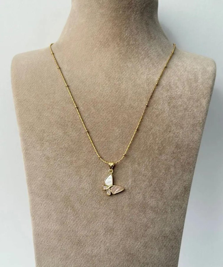 Altın renkli, zincir detaylı kısa kolye. Minimalist kelebek figürü ile günlük kullanıma uygun.