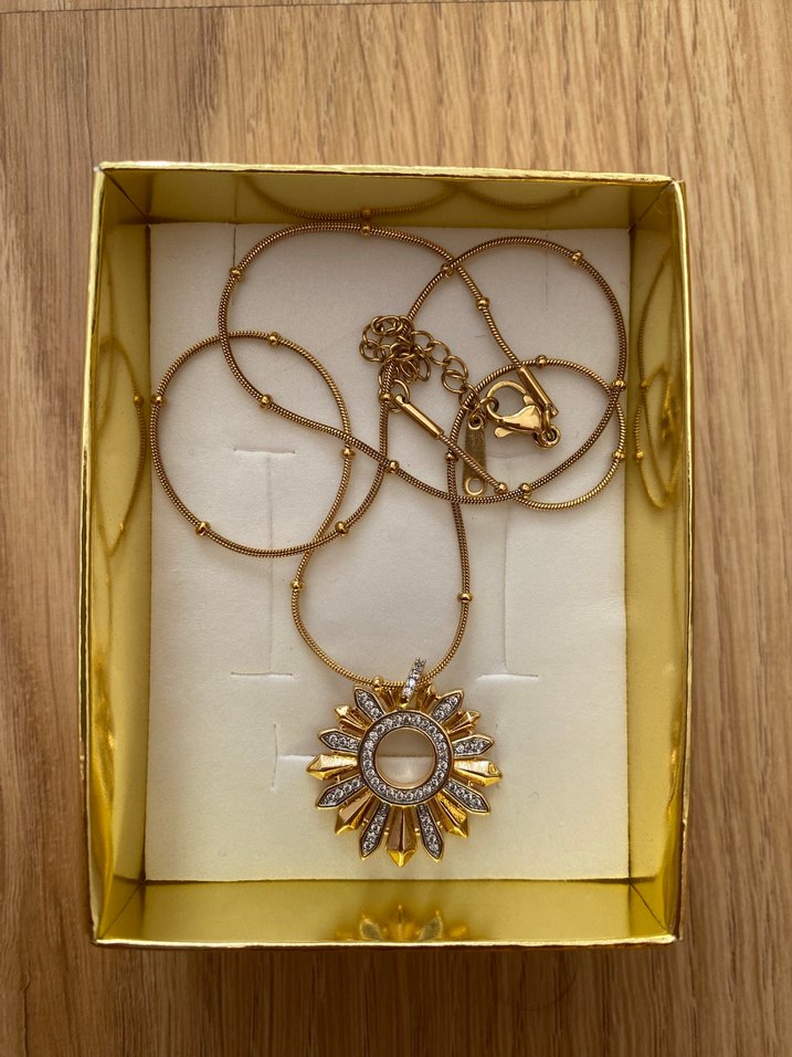 Altın renkli zincir detaylı kısa kolye, parlak taşlarla süslenmiş güneş figürlü uç. Günlük kullanım için uygun, klasik ve çağdaş tarzı birleştirir. Çelik kolye