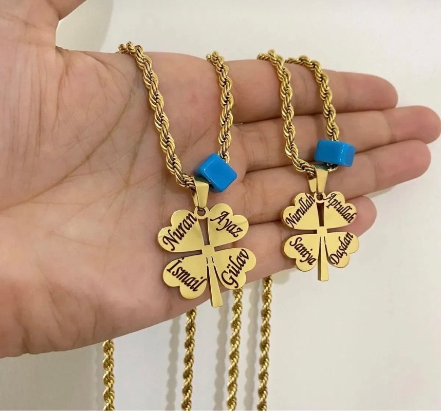 Altın renkli kısa zincir kolye, dört yapraklı yonca şeklinde isimler işlenmiş. Bohem tarz, renkli ve günlük kullanıma uygun.