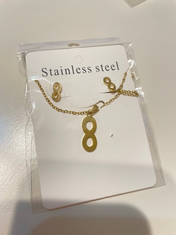 Parlak zincir detaylı, paslanmaz çelikten yapılmış sonsuzluk figürlü kısa altın renkli minimalist kolye küpe seti. ✨