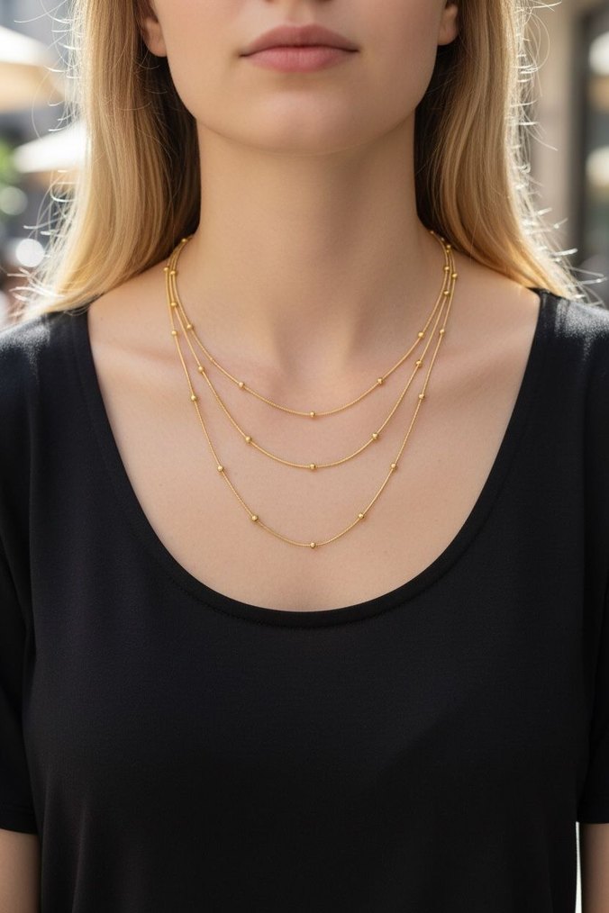 Parlak altın renkli, kısa uzunlukta, zincir detaylı ve küçük boncuklu minimalist kolye, günlük ve sokak stiline uygun. ✨