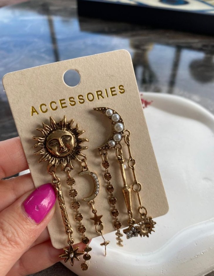 Altın renginde, zincir detaylı, güneş, yıldız ve ay figürlü uzun bohem tarzda küpeler.