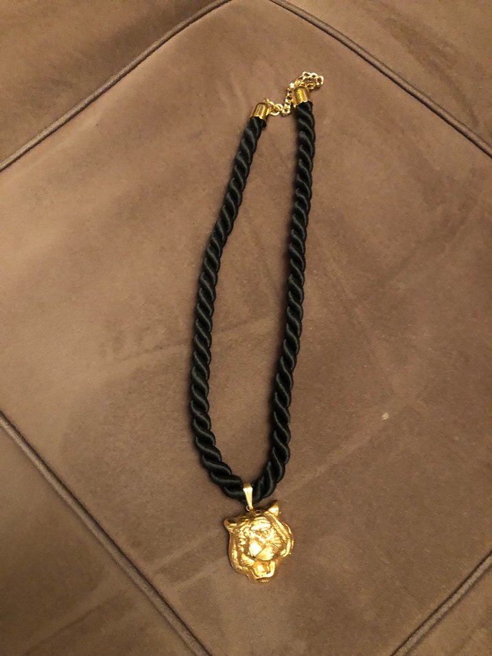 Kadınlar için tasarlanmış, kıvrımlı siyah kordon ve altın renkli aslan deseni kolye ucu bulunan vintage tarzda, romantik geceye uygun midi uzunlukta kolye.