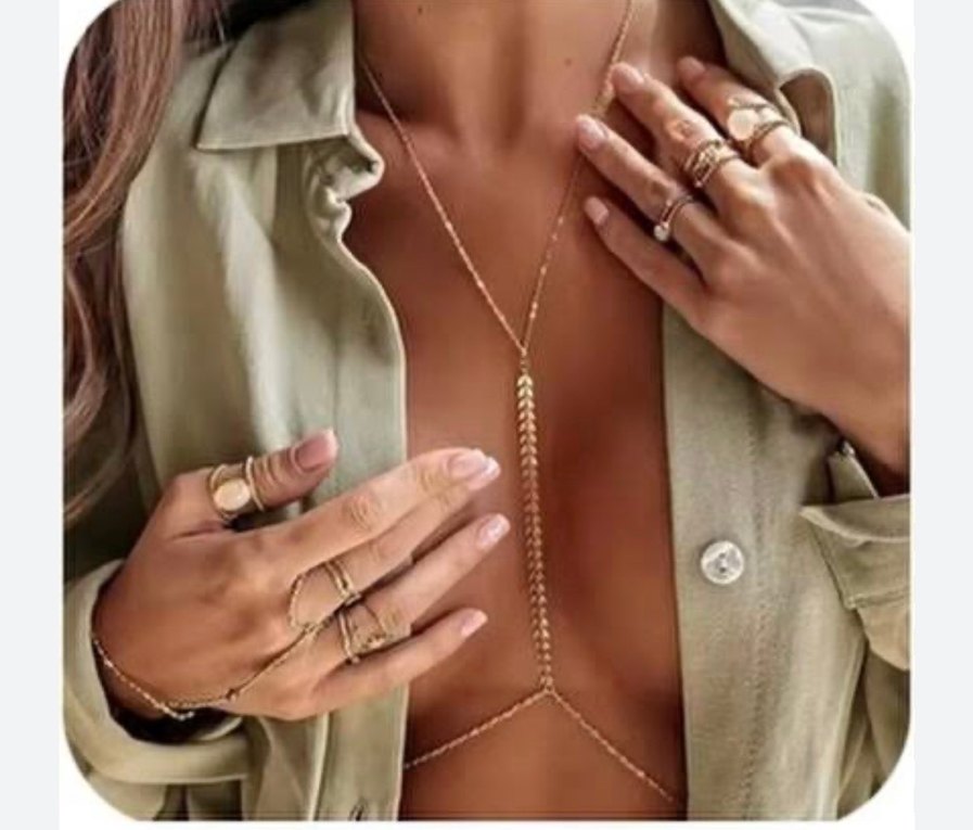 Altın renkli, zincir detaylı ve yılan desenli vücut zinciri, günlük kullanıma uygun cesur ve göz alıcı bir aksesuar. ✨