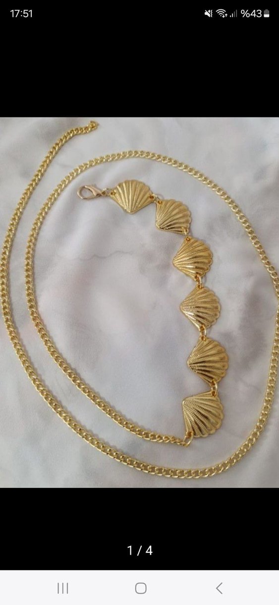 Altın renkli, parlak yüzeyli ve kabuk şeklinde detaylı vücut zinciri. Glamour ve bohem tarzlara uygun, düğünler için ideal. ✨