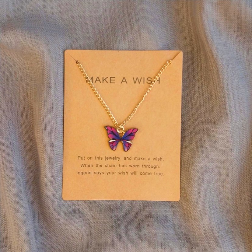 Canlı baskılı kelebek figürlü, kısa altın zincirli kolye. Bohem ve minimal tarzda, günlük kullanıma uygun.