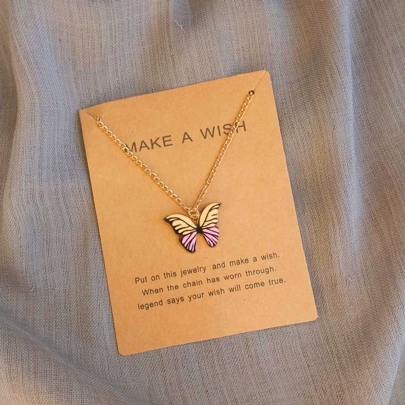 Canlı baskılı kelebek figürlü, kısa altın zincirli kolye. Bohem ve minimal tarzda, günlük kullanıma uygun. Zincir aşındığında dileğinin gerçek olacağına dair kartla beraber gelir.