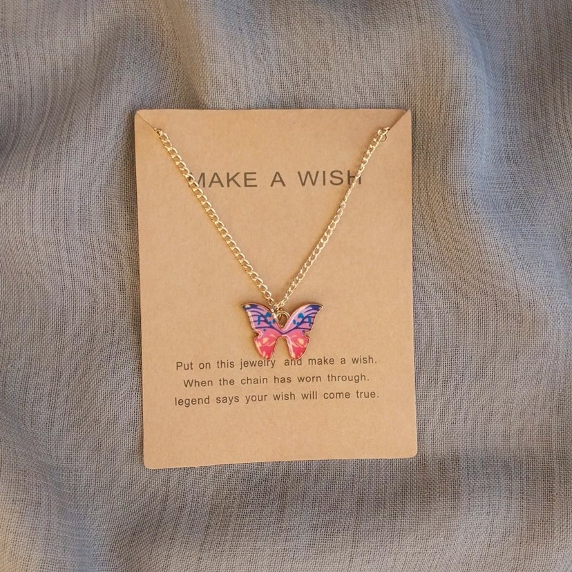 Renkli baskılı kelebek figürlü, altın zincir detaylı bohem kolye. Takarken dilek tutma efsanesiyle günlük kullanım için uygun.