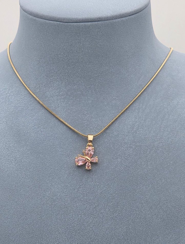 Altın renkli Kelebek zincirli kolye, pembe taşlı fiyonk şeklinde uç kısmı ve Kelebek detaylı günlük kullanıma uygun minimal ve klasik tarzda. Çeliktir.