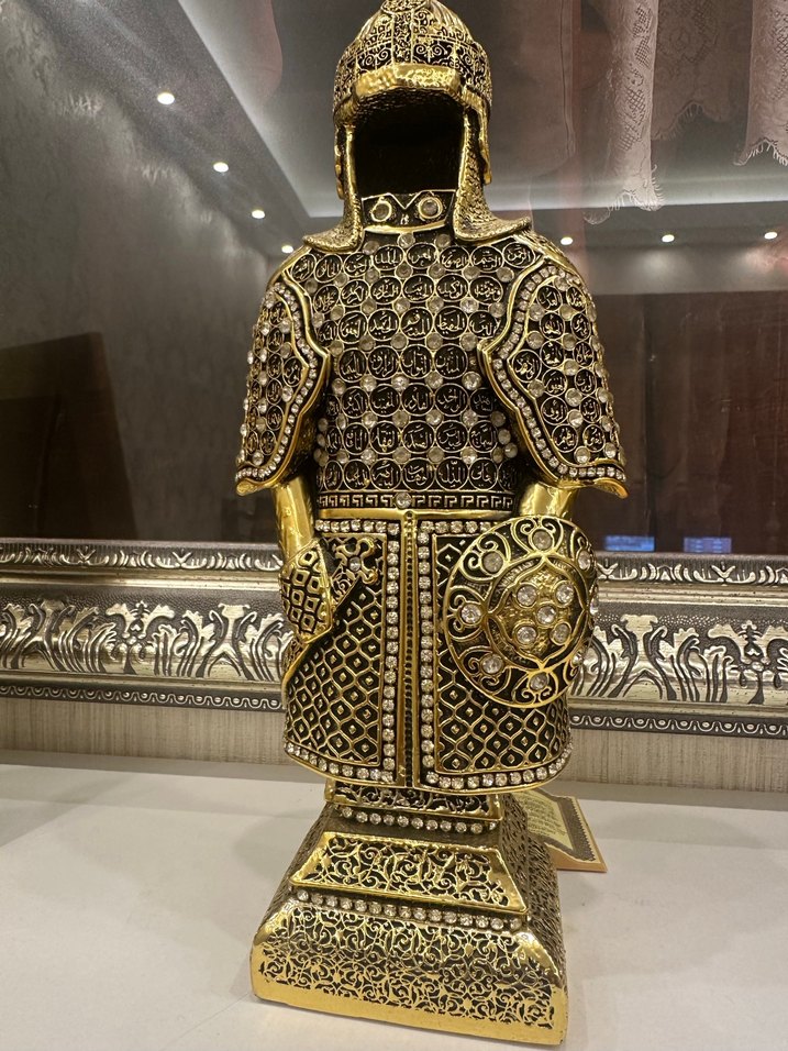 Altın renkli, detaylı zırh ve kalkanlı savaşçı figürini, süslü bir kaidede durmaktadır. ️