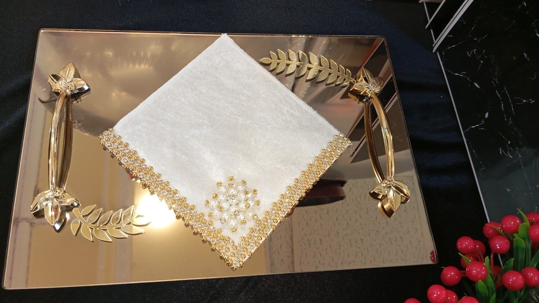 Altın renk işlemeli ve köşesinde inci detayları bulunan klasik tarzda kahve Sunum mendili, şık ve gösterişli bir dokunuş sunar. ✨