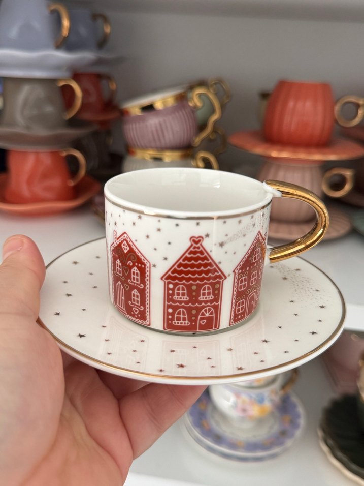 Altın saplı beyaz fincan ve tabağında koyu kırmızı ev desenleri ve küçük yıldız detayları bulunur. ☕