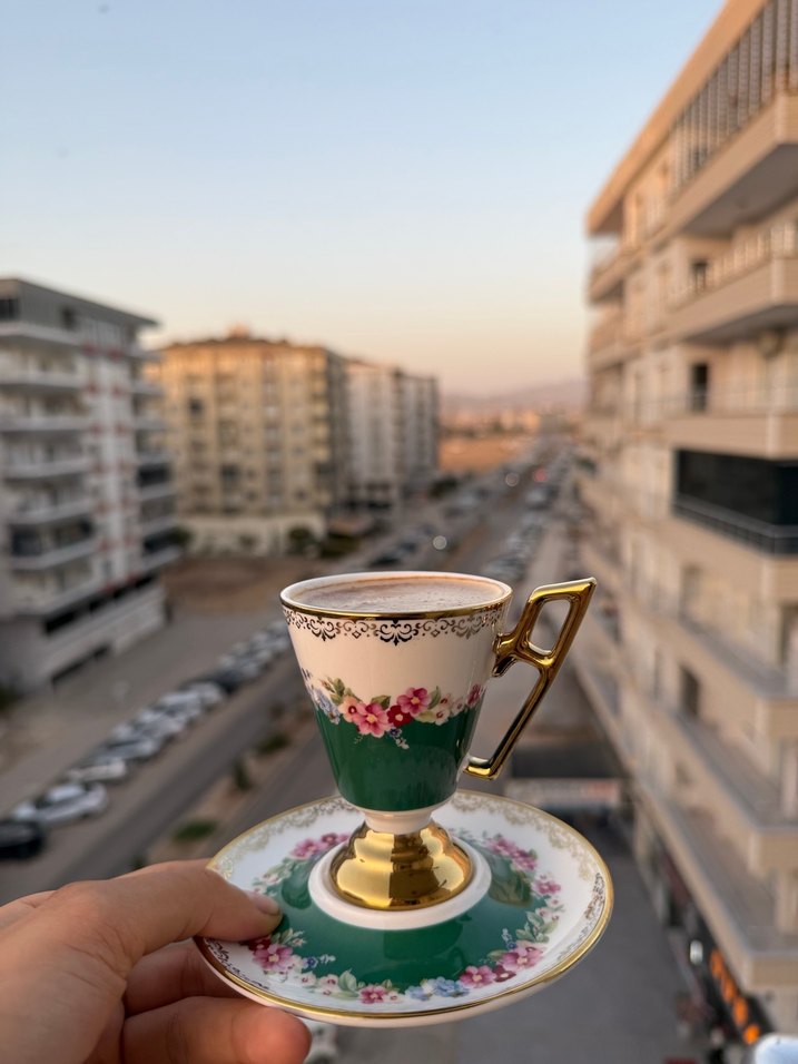 Altın saplı, yeşil-beyaz zeminli ve çiçek desenli kahve fincanı, uyumlu tabağı ile birlikte sunulur. ☕