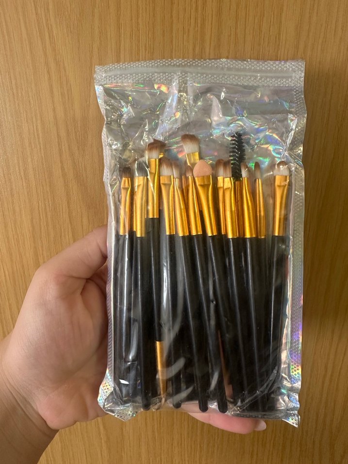 Altın saplı ve koyu renk saplı çeşitli makyaj fırçalarından oluşan set, hassas uygulama ve karıştırma için uygundur.