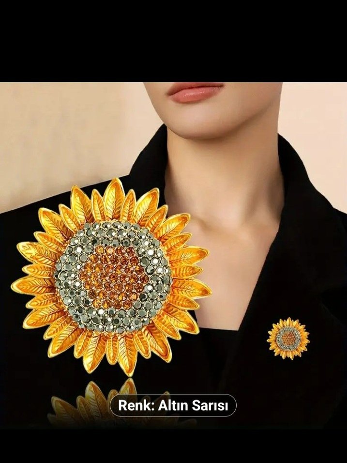 Altın sarısı renginde, Ayçiçeği payetli broş. Bohem ve ışıltılı tarzları günlük kullanıma uygun şekilde birleştirir.