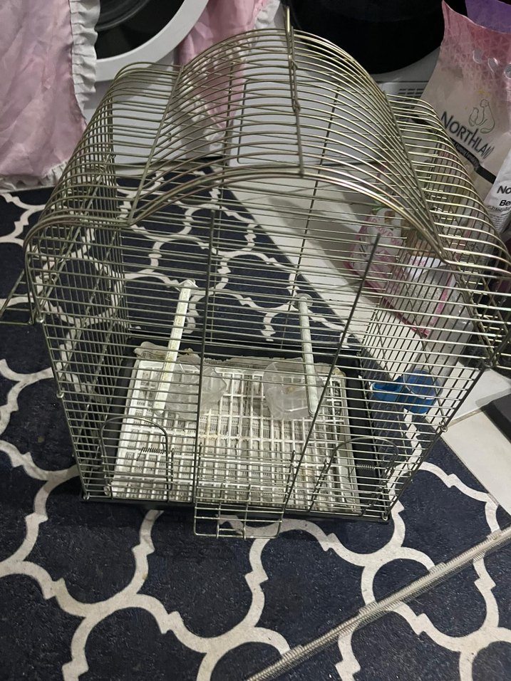 altınsarı renkte, kavisli üst yapıya sahip kuş kafesi. İçinde iki tünek ve yemlik kapları bulunur, küçük kuşlar için güvenli ve rahat ortam sağlar. 33/45/26