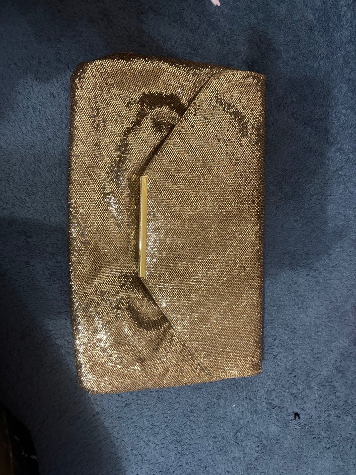 Kadınlar için altın parlak kumaştan çanta. Fermuarlı ve çağdaş, romantik akşamlar için uygun. İster zincirli ister zincirsiz kullanılabilir. Bir defosu yok.