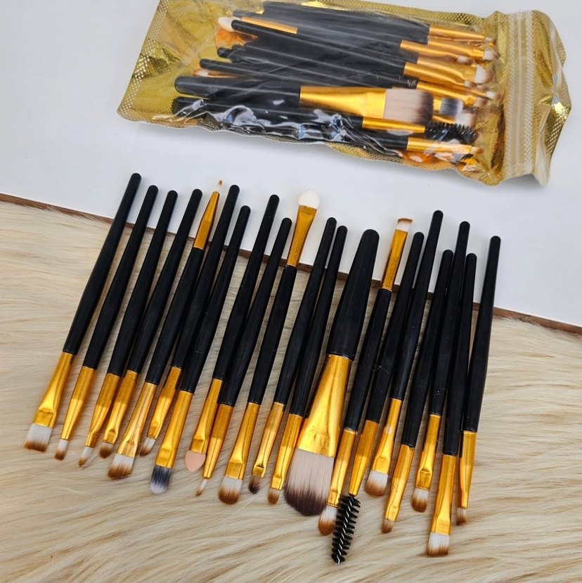 Siyah saplı ve altın renkli metal detaylı makyaj fırçaları çeşitli uygulamalar için farklı fırça tipleri içerir. Şeffaf altın renkli çantasıyla gelir. ️