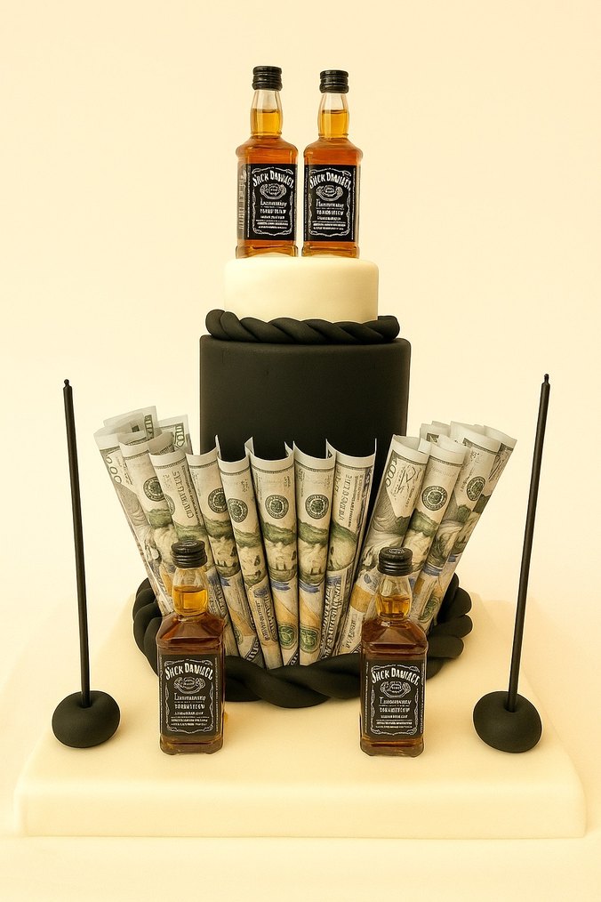 Altın detaylı koyu renk temalı parti süslemeleri, mini viski şişeleri ve kıvrılmış dolar banknotlarıyla şık bir görünüm sunar.