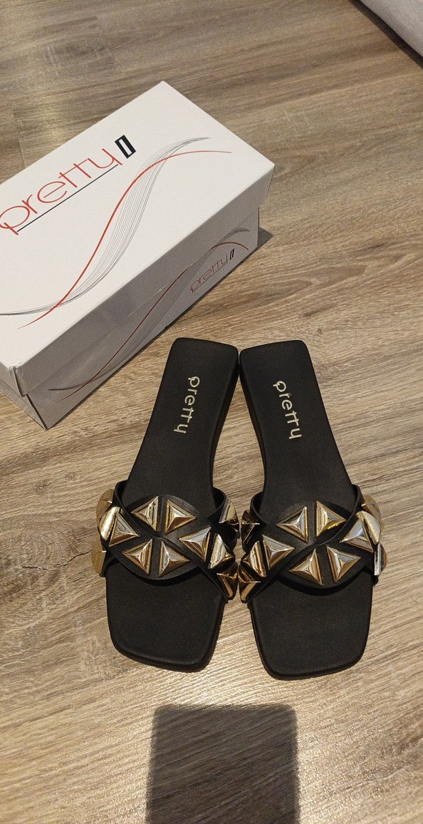 Kadın terlikleri, blok topuklu ve tokalı altın desenlidir. Kauçuk malzemeden olup, günlük sokak stili için cesur bir seçenektir. İç tabanda 'pretty' yazısı bulunur. suni deriden ama derisi kalıteli hiç giyilmedi üstündeki altın detaylar metalik değildir
