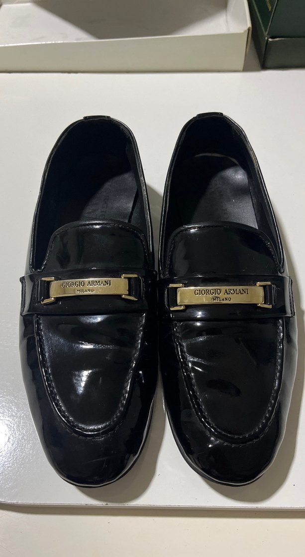 Giorgio Armani imzalı, parlak altın tokalı erkek klasik ayakkabı. Lastik tabanlı, ofis ve sokak stiline uygun.