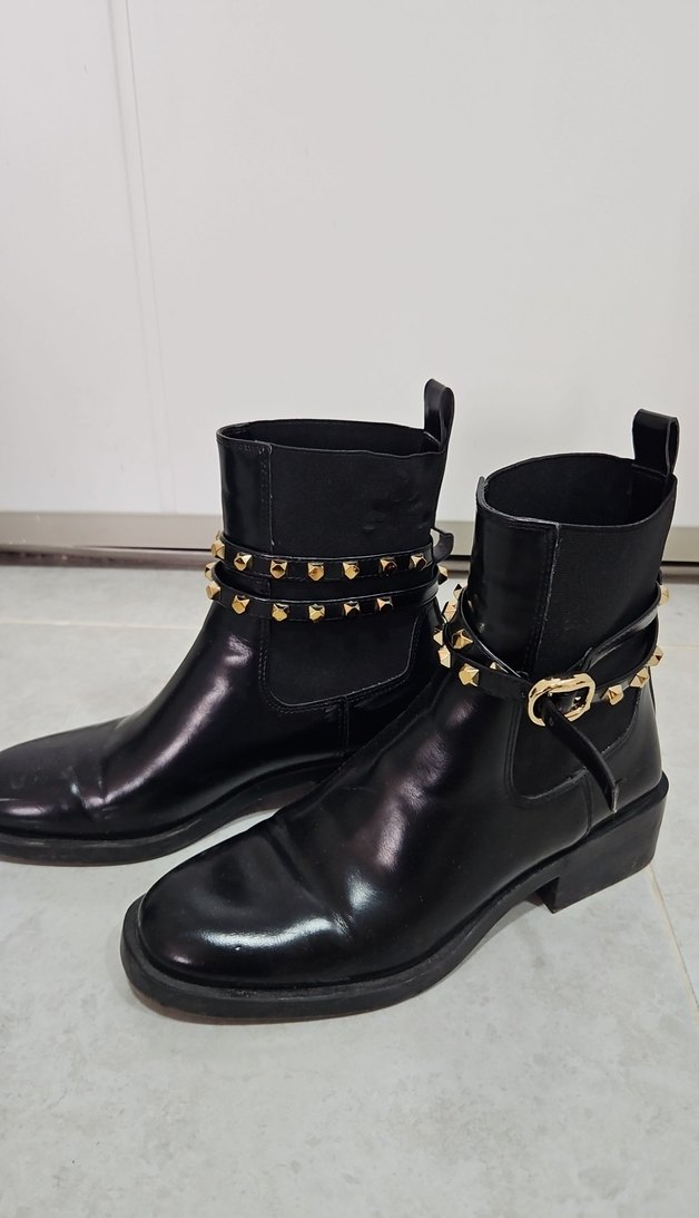Parlak siyah deri botlar, altın tokalı kayışlar ve çivili detaylarla, blok topuklu, günlük kullanım için rock punk tarzında. ⚡