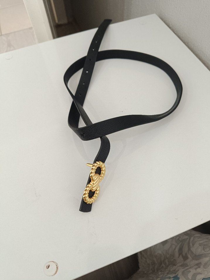 Siyah deri kemer, altın renkli benzersiz tokasıyla minimalist ve şık bir streetwear tarzı sunar.