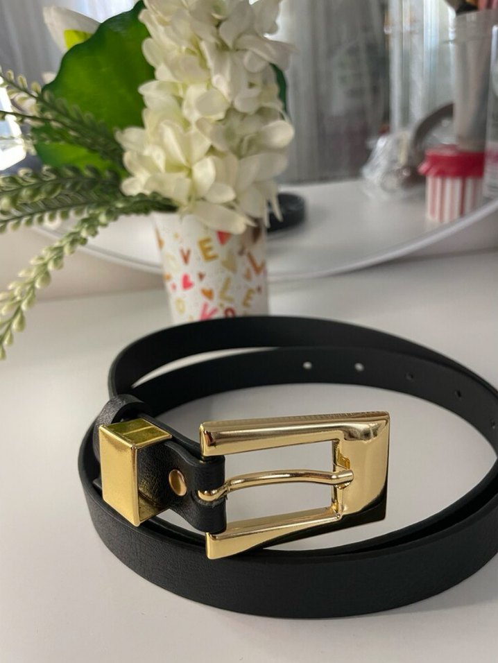 Klasik zarafeti yansıtan koyu deri kemerde parlak altın tokalar bulunur, çağdaş Paris esintisi taşır.