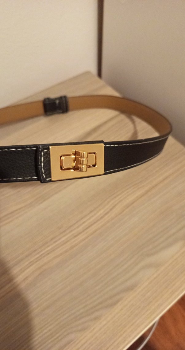uzunluğu arka kısmından ayarlanabilir. yeni ve kullanılmamıştır. derisi oldukça kaliteli, toka kısmı altın renkli metaldir. uzunluğu 104cm, genişliği 2,5 cm dir.