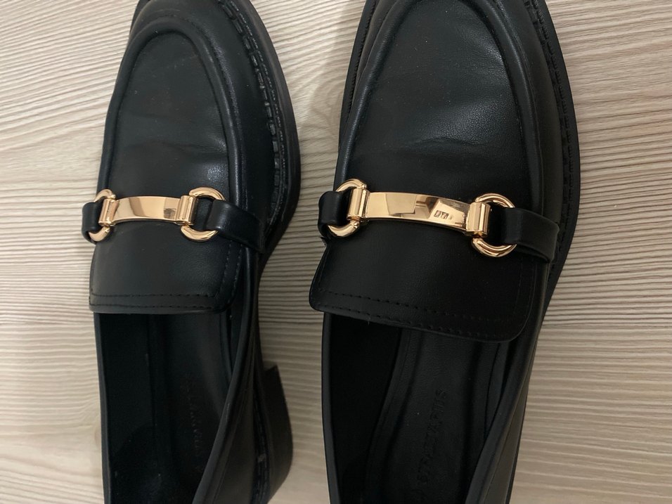 Siyah deri kadın loafer ayakkabılar, parlak altın tokalı ve blok topuklu, klasik zarafet ile Paris sokak tarzını ofis için birleştirir.