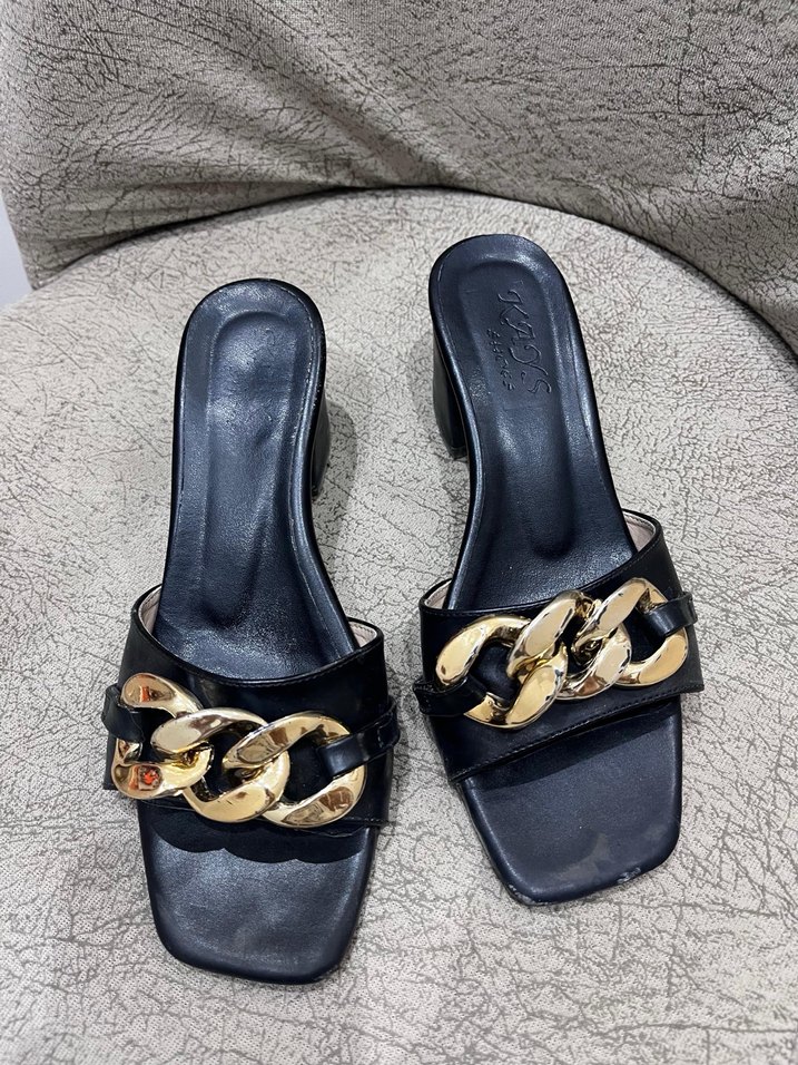 Siyah kadın terlik, blok topuklu ve parlak altın tokalı detaylıdır. Dayanıklı kauçuk malzemeden üretilmiş, klasik yılan desenli çağdaş tasarıma sahiptir. Günlük kullanım için uygundur.