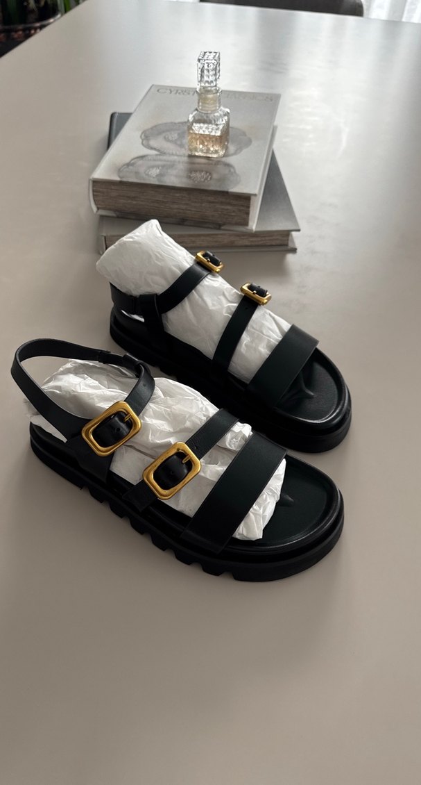 Siyah kauçuk platform topuklu kadın sandalet, altın tokalarla tamamlanmıştır. Günlük kullanıma uygun, trend sokak tarzını yansıtır. Hakiki deridir özel üretimdir