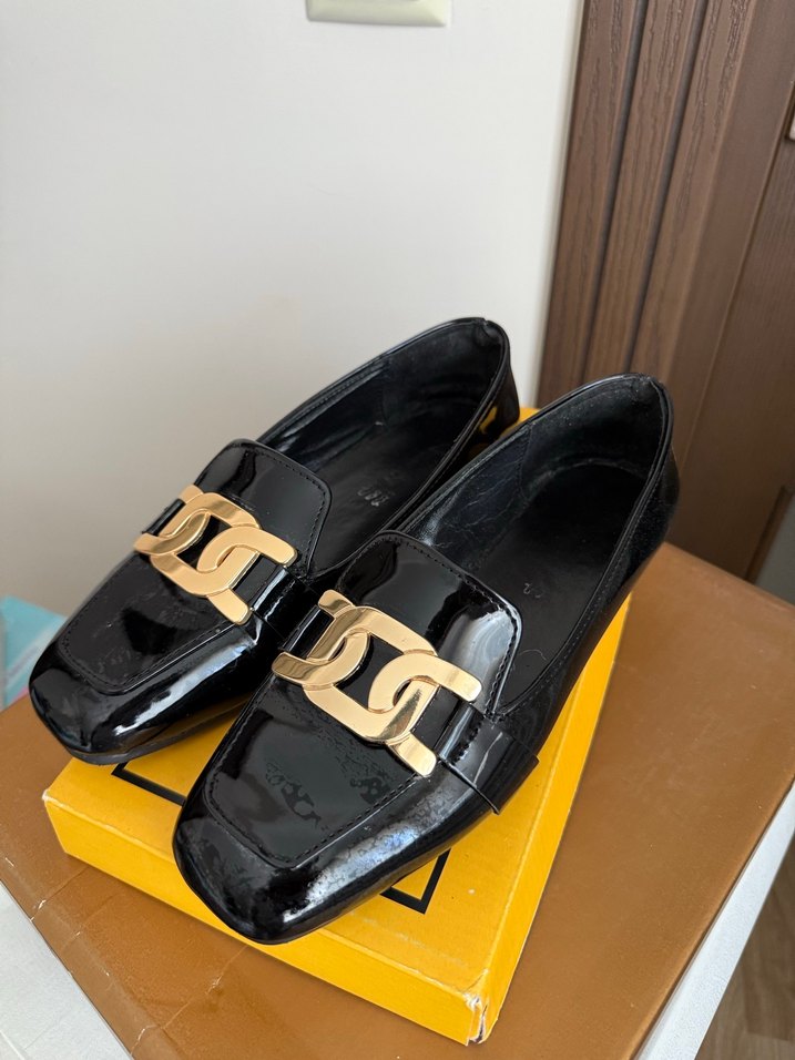 Altın tokalı, blok topuklu siyah rugan kadın loafer, hafif yılan desenli klasik sokak stili ayakkabı.