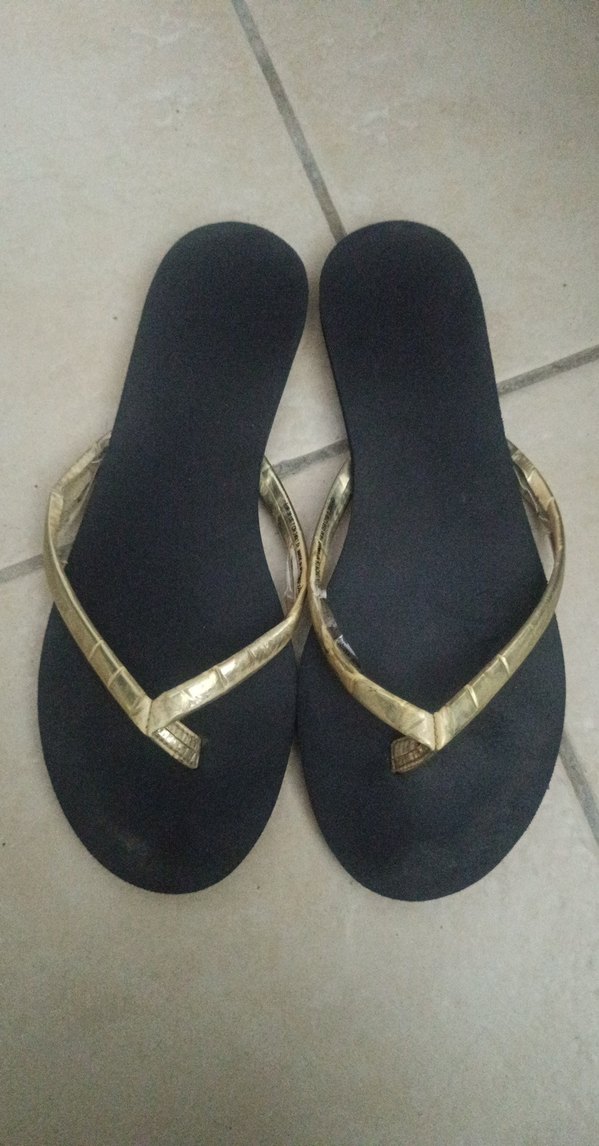 Kadın terlikleri, parlak altın tokalı kayış ve yılan derisi desenine sahip stiletto topukludur. Kauçuk malzemeden yapılmıştır, günlük kullanım için sade ve minimalist stildir.