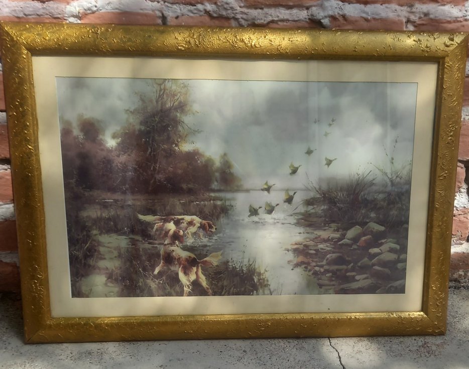 Parlak altın varaklı çerçevede, nehir kenarında köpeklerin olduğu doğal manzara tablosu. Huzurlu bir dış mekan sahnesi sunar. ️