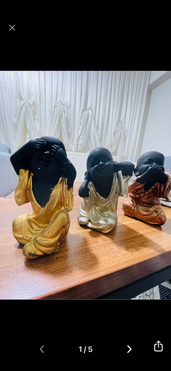 Altın, gümüş ve bronz renkli cübbeler giymiş üç siyah figürinden oluşan set, farklı el hareketleriyle oturuyor.