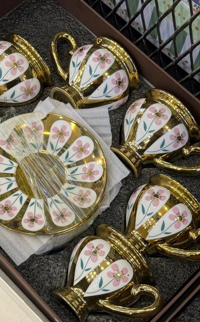 Altın renkli, pembe çiçek desenli porselen fincan seti, şık ve zarif bir görünüm sunar. Çay veya kahve sunumu için uygundur. ☕