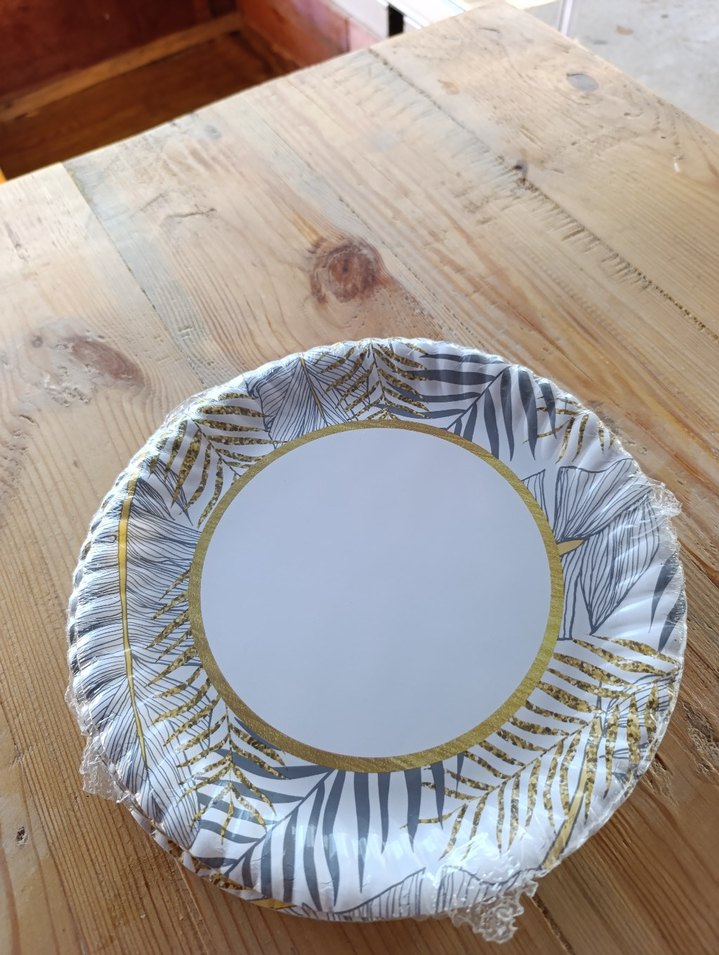 Gri ve altın yaprak desenli, altın kenarlıklı yuvarlak karton tabak ️