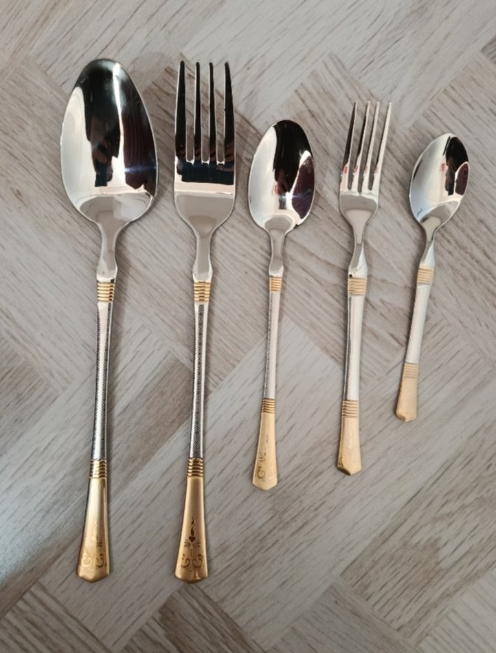 Altın ve gri detaylara sahip 5 parçadan oluşan çatal kaşık seti, şık ve kullanışlıdır.