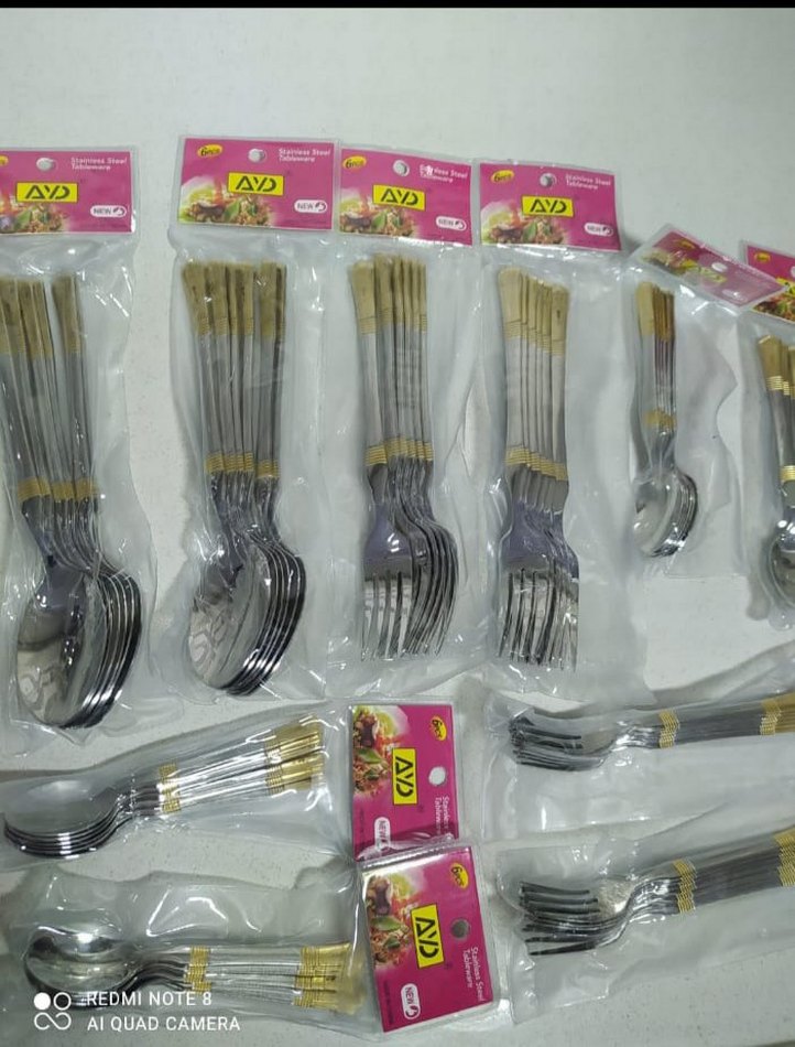 Altın saplı ve gri detaylı çatallar ve kaşıklar içeren çatal kaşık seti. Pembe etiketli şeffaf ambalajda.
