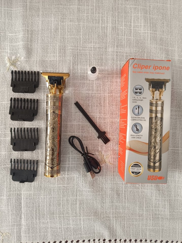 Altın ve gri renkte kablosuz saç kesme makinesi, farklı tarak başlıkları ve USB şarj kablosu ile birlikte gelir. Ayarlanabilir kesim uzunlukları ve temizlik fırçası bulunur. ✂️