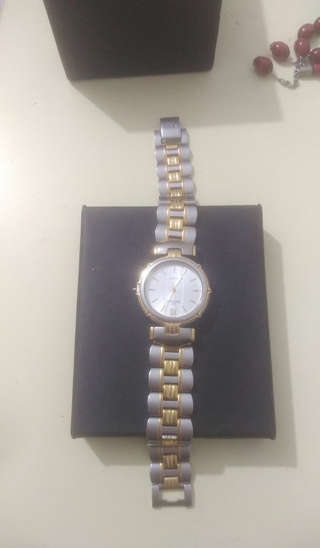 Altın ve gri tonlarda metal kayışlı, yuvarlak beyaz kadranlı klasik ve çağdaş tasarıma sahip kadın kol saati. ⌚