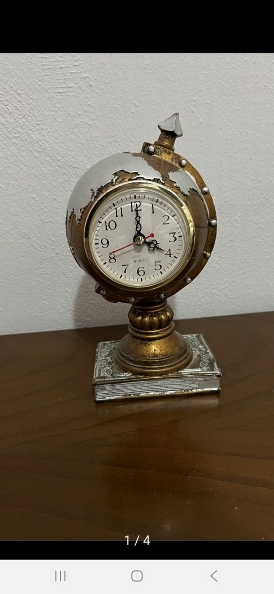 Altın ve gri renklerde, vintage küre şeklinde masa saati. Siyah akrep yelkovan ve kırmızı saniye ibresi bulunur. ️